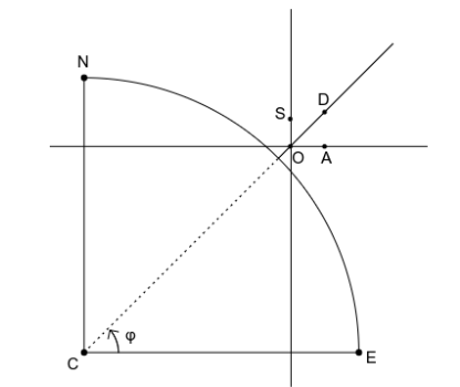 On reprend les notations de la figure précédente. Le plan $OAD$ est le plan méridien de midi et le plan $OBC$ est un autre plan méridien. Les droites $(AD)$ et $(BC)$ sont parallèles à l'axe du style et les droites $(AB)$ et $(DC)$ sont parallèles.